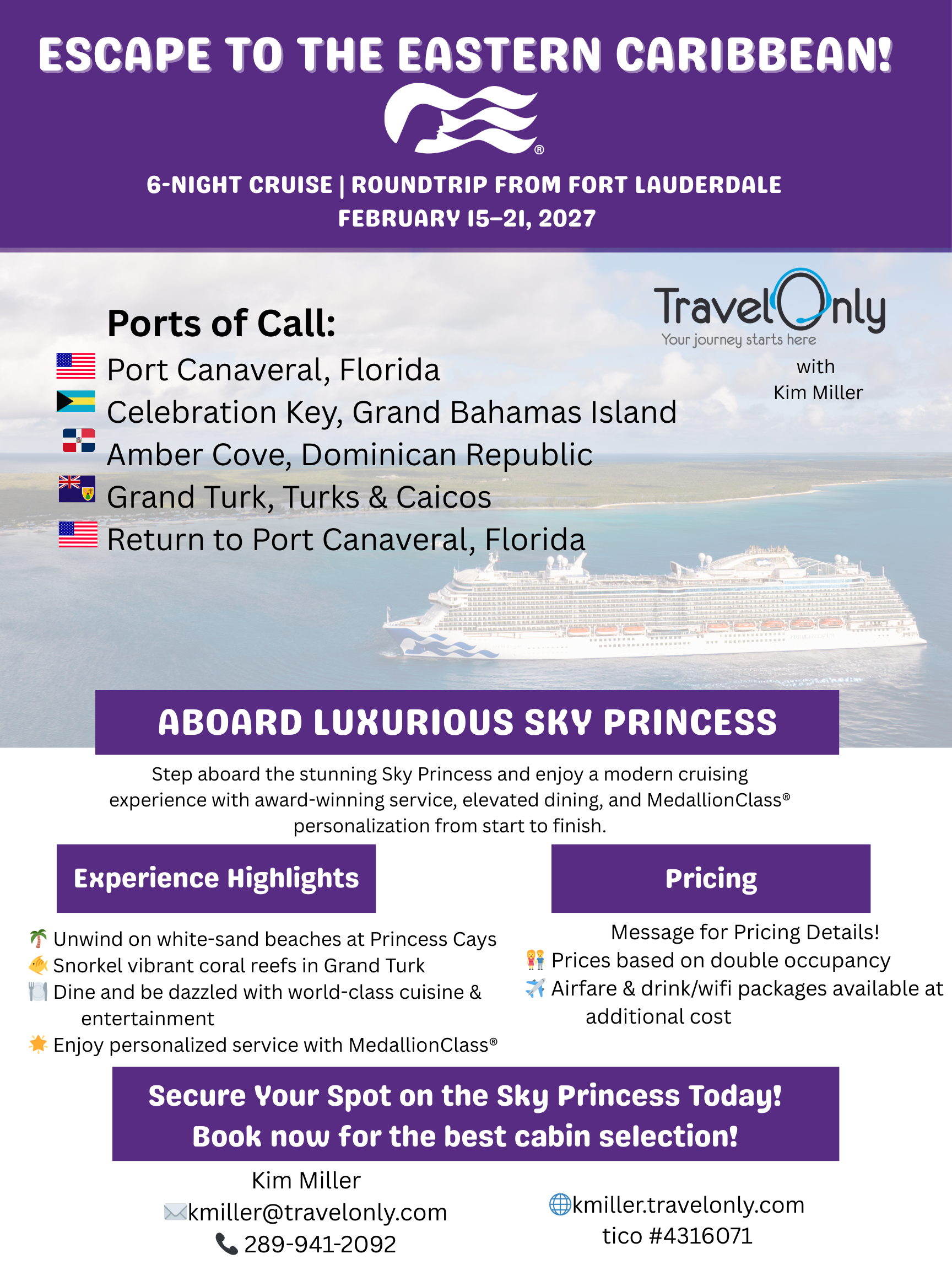 6-Night Roundtrip Cruise from Fort Lauderdale aboard the Luxurious Sky Princess Februrary 15-21, 2027