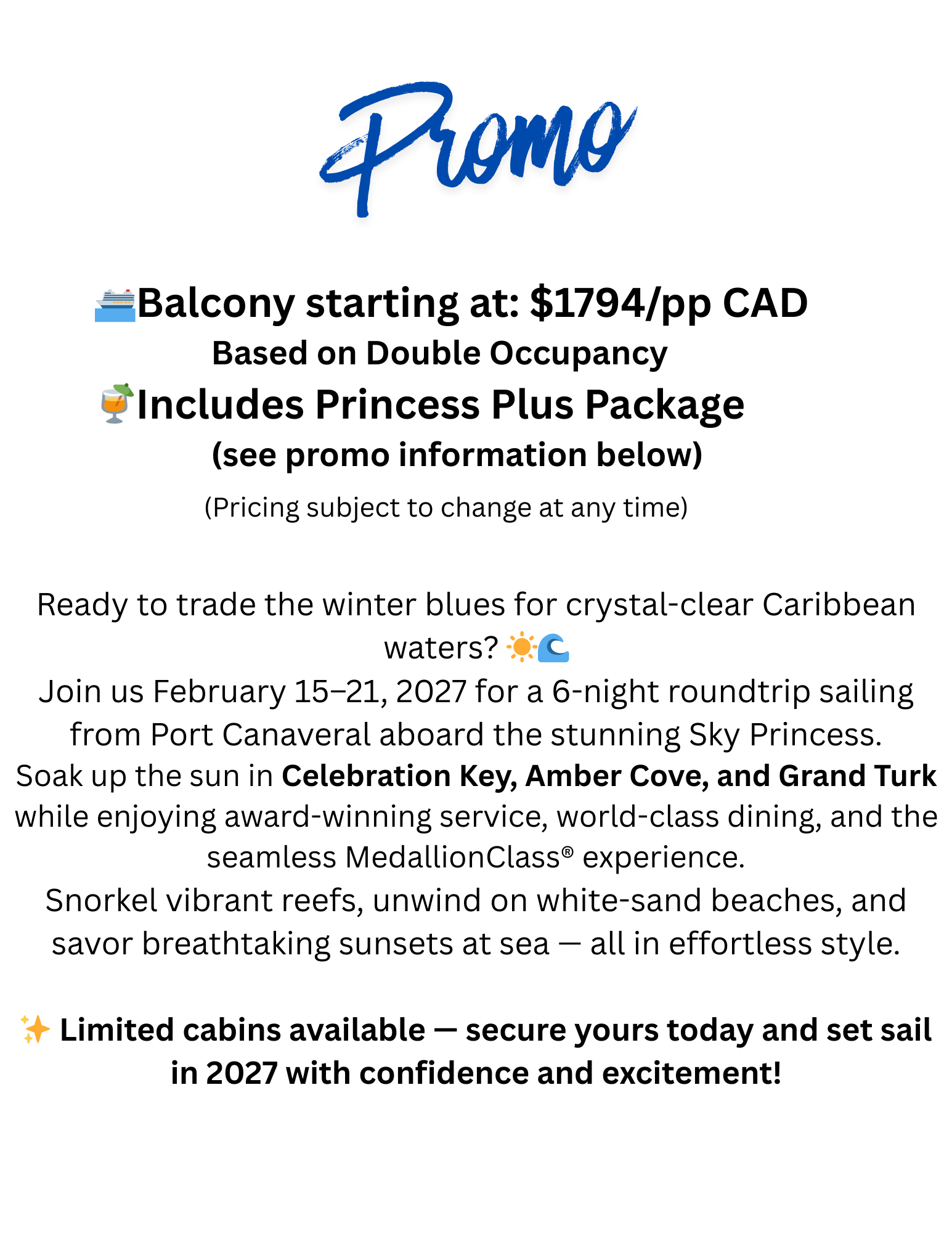 Terms, conditions and restrictions apply; pricing, availability, and other details subject to change and/ or apply to US or Canadian residents. Please confirm details and booking information with your travel advisor.